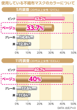 今回、当社が不織布マスクのカラーについて独自に調査したところ、ベージュカラーの使用率が上がっており、約4割の女性の方が使用していることが分かりました(下図参照)。そこで、肌になじみやすく人気のベージュカラーの「ビースタイル プリーツタイプ 涼やか心地 ライトベージュ」から、たっぷり使える『20枚入』の限定企画品を新発売いたします。