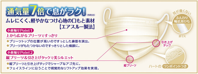 「ビースタイル プリーツタイプ 涼やか心地」は、通気量が従来の不織布マスクの7倍※で、ふわりと軽やかなつけ心地のマスクとして2018年の発売以来、好評をいただいています。また、爽やかで呼吸が楽なだけではなく、形にもこだわったキレイライン形状で、美しいシルエットを叶えるマスクです。アゴ部分の縦プリーツと、両サイドの引き上げタックによりフェイスラインがスッキリときれいに見えます。加えて、プリーツトップの位置を上げることにより、プリーツが上から広がり横顔もきれいです。※当社比