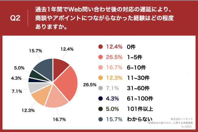 「Q2.過去1年間でWeb問い合わせ後の対応の遅延により、商談やアポイントにつながらなかった経験はどの程度ありますか。」(n=324)と質問したところ、「1~5件」が26.5%、「6~10件」が16.7%という回答となりました。