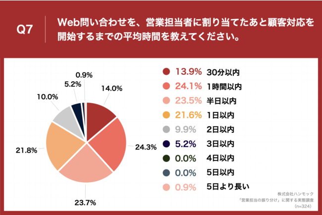 「Q7.Web問い合わせを、営業担当者に割り当てたあと顧客対応を開始するまでの平均時間を教えてください。」(n=324)と質問したところ、「1時間以内」が24.1%、「半日以内」が23.5%という回答となりました。