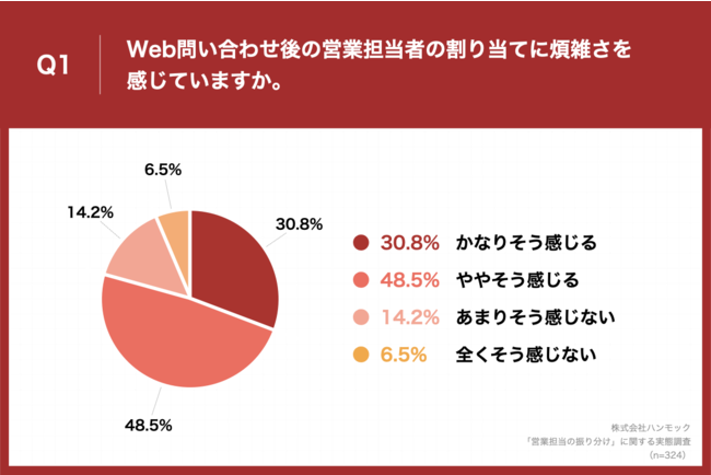 「Q1.Web問い合わせ後の営業担当者の割り当てに煩雑さを感じていますか。」(n=324)と質問したところ、「かなりそう感じる」が30.8%、「ややそう感じる」が48.5%という回答となりました。