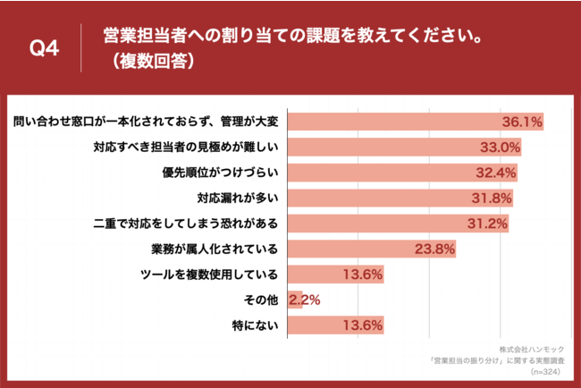 「Q4.営業担当者への割り当ての課題を教えてください。(複数回答)」(n=324)と質問したところ、「問い合わせ窓口が一本化されておらず、管理が大変」が36.1%、「対応すべき担当者の見極めが難しい」が33.0%、「優先順位がつけづらい」が32.4%という回答となりました