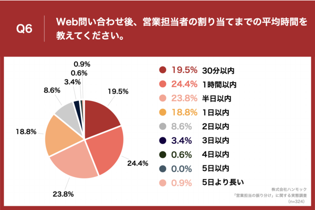 「Q6.Web問い合わせ後、営業担当者の割り当てまでの平均時間を教えてください。」(n=324)と質問したところ、「1時間以内」が24.4%、「半日以内」が23.8%という回答となりました。
