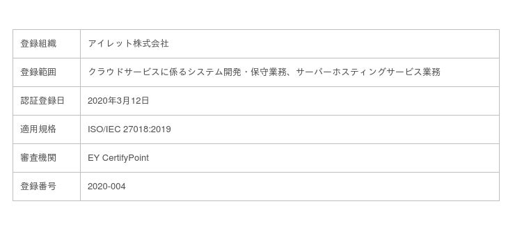 アイレットでは、国際的なセキュリティ認証について、その重要性を強く認識し、各認証が要求する事項への準拠および独立した第三者機関による各認証の取得に注力しております。2020年3月時点では今回取得した認証のほかにプライバシーマーク、情報セキュリティの国際規格「ISO/IEC 27001」、「ISO/IEC 27017」、ITサービスマネジメントの国際規格「ISO/IEC 20000-1」、クレジットカード業界におけるグローバルセキュリティ基準PCI DSSの認証を保有しています。また、米国公認会計士協会(AICPA: American Institute of CPAs http://www.aicpa.org)が定める、財務報告目的以外の受託サービスに関する内部統制の保証報告書であるSOC 2 保証報告書Type1、2を受領しています。