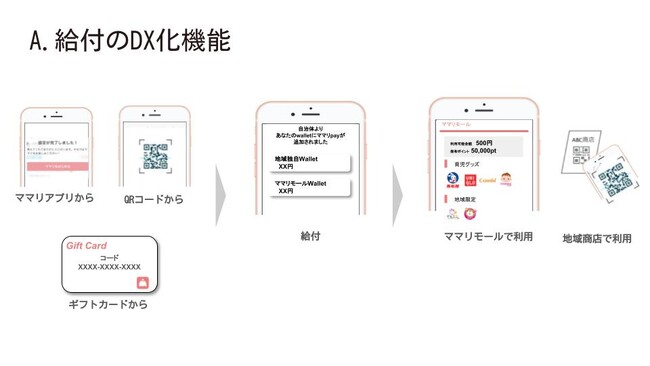経済的支援(出産・子育て応援ギフト)の給付のデジタル化を実現します。また、給付方法はアプリ以外にギフトカードやQRコードでも可能です。