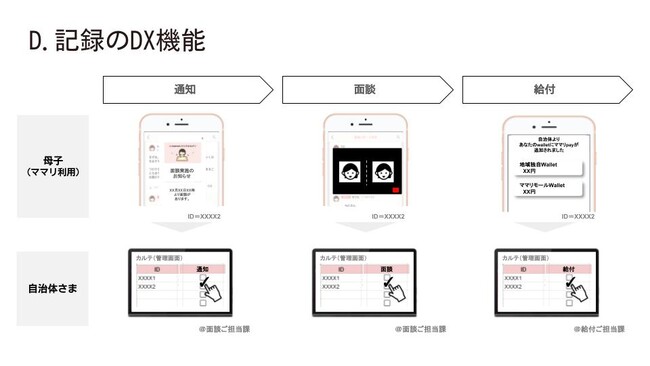 母子に対する面談・通知・給付の記録をデジタル化を実現します。また、既存のカルテ等にもIDを紐づけて負荷なく情報連携することが可能です。