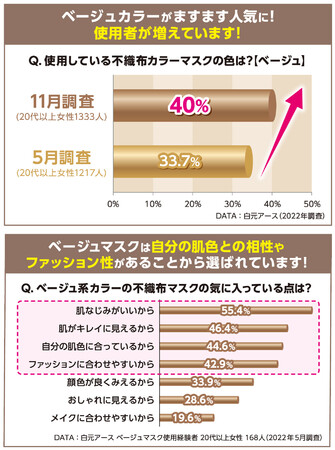 日常的にマスクを着用するようになり、マスクのラインナップも充実してきました。今回、当社が独自に調査したところ、女性のベージュカラーの不織布マスクの使用率が上がっており、その理由は自分の肌の色との相性やファッション性によることが分かりました(下図参照)。
