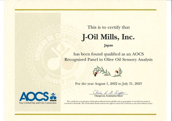 株式会社J-オイルミルズ(東京都中央区、代表取締役社長:佐藤 達也、以下当社)のオリーブオイル官能評価チームはこのほど日本の製油企業で初めてアメリカ油化学会(American Oil Chemists' Society、以下 AOCS)から5年連続でオリーブオイル官能評価パネルに認定されました(認定期間:2022年8月1日から2023年7月31日)。なお昨年に引き続き、当試験最高成績の1st Place (1位)を獲得しています。当認定はAOCSのオリーブオイル官能評価に関する技能評価試験を受験し、AOCSが定める技能評価基準を満たした機関・団体に与えられます。官能評価とは、人間の微細な感覚を用いて製品の風味等を判定する検査を指します。