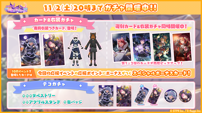 ※「ハロウィン!すとぷりと不思議なおばけの街 第3弾 カード&衣装ガチャ」から誕生日限定★3カード、「すとぷり×サンリオキャラクターズ 一夜限りのマジカルライブ」に関連した★3カードは手に入りません