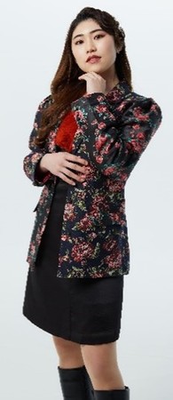 ピンクのタートルネックで華やかさを表現しつつ、黒のセットアップで締め色を取り入れることにより力強さを表現。