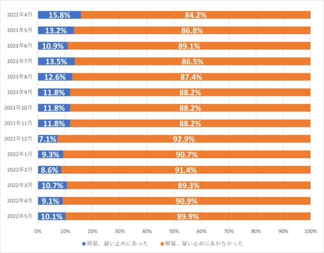 ■「解雇、雇い止めにあった」割合、2022年4月、5月は、前年比で減少