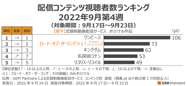 エンタテイメント業界に向けたデータ×デジタルマーケティングサービスを提供するGEM Partners株式会社(ジェムパートナーズ、所在地:東京都港区、代表取締役:梅津文)は9月30日(金)、複数の定額制動画配信サービスを横断して集計した2022年9月第4週の「配信サービス視聴者数ランキング(調査対象期間:9月17日〜9月23日、調査対象:日本在住15〜69歳男女)」を発表します。