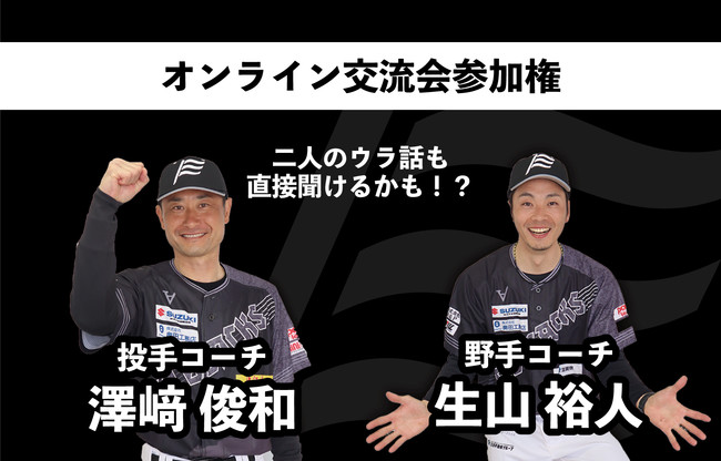 ‥オンライン上で元広島東洋カープ・澤崎俊和コーチと元千葉ロッテマリーンズ・生山裕人コーチとの10分〜15分の交流会への参加権となります。(交流会の開催は、シーズン終了後の10月以降を予定しております。)
