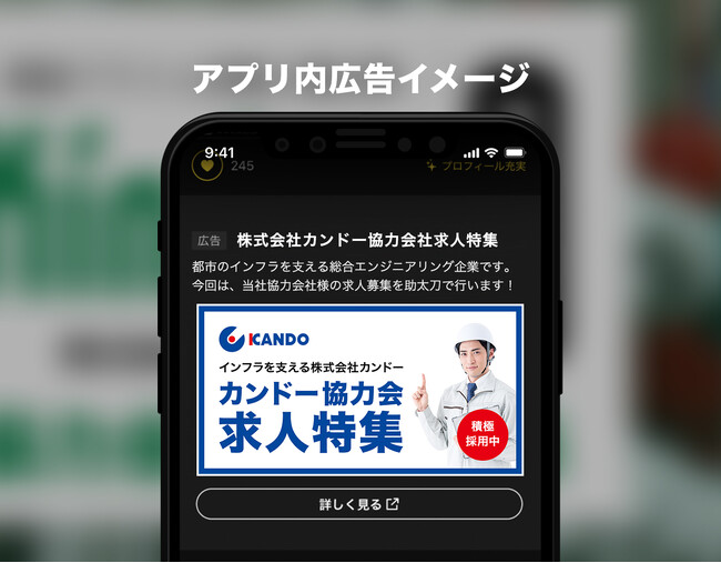 「助太刀社員」トップページに、「カンドー協力会求人特集ページ」をリリースいたします。また、協力会社の求人票には「カンドー」のロゴをバッジとして表示し、カンドーのブランド力を活用することで協力会社の採用成功を目指します。