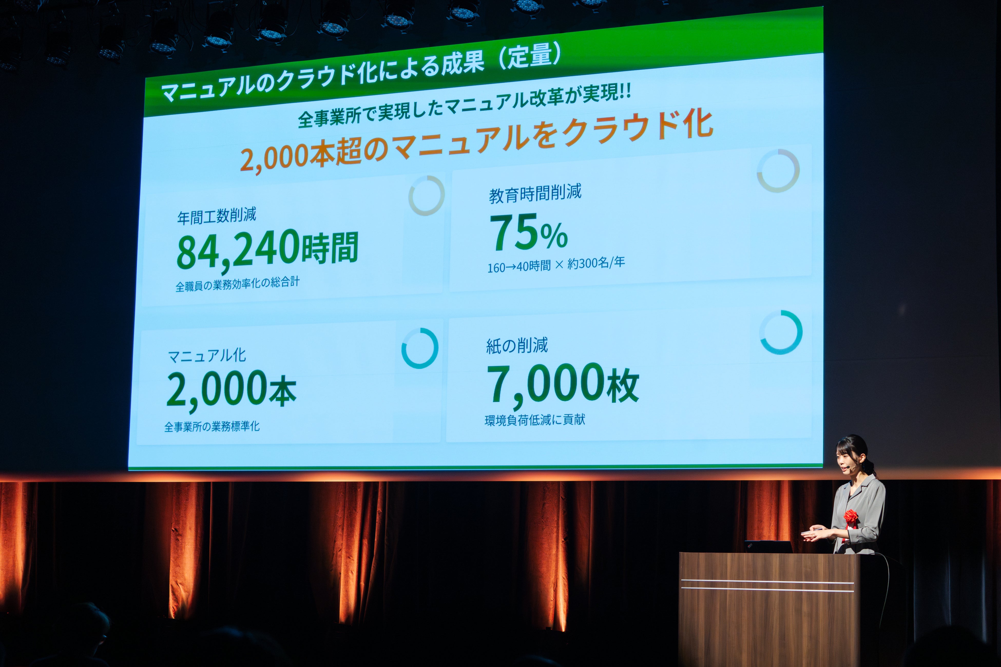 受賞理由: 創業100周年を迎える医療・福祉グループとして、紙ベースだった業務マニュアル2,500本以上をクラウド化。ITが苦手な職員への丁寧な定着支援を行い、法人全体で年間84,240時間の業務時間を削減。「利用者に向き合う時間」を創出した点が評価されました。