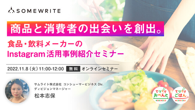 企業のコンテンツマーケティングやメディアビジネス等を支援するサムライト株式会社(本社:東京都渋谷区、代表取締役CEO:池戸 聡、以下「サムライト」)は、自社アカウント運用の経験から得た知見を生かし、食品・飲料メーカーの担当者向けに、Instagramメディア「てづくりごはん365」を活用したタイアップ事例をご紹介するオンラインセミナーを11月8日(火)11:00〜開催いたします。