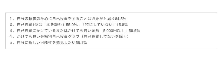 一方で長時間労働是正で得られた後の時間をどう使うのかについて考えることも大切です。今回の調査では、自己投資をテーマにアンケートを行いました。