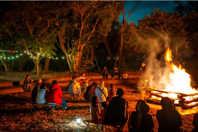 迫力あるキャンプファイヤーはイベントならではのお楽しみ。暖かい炎を囲んで語り合えるスペースをご用意いたします。※写真は前回の様子