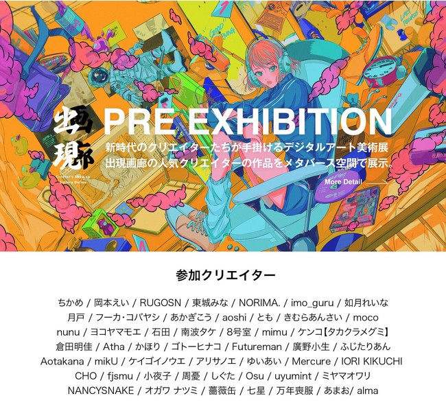 メタバース画廊に参加するのは、8月20日から開催される「出現画廊 in名古屋パルコ」の出展クリエイターの中から選ばれた50名のアーティストです。彼ら・彼女らの代表作を、本人の解説文とともにお楽しみいただけます。