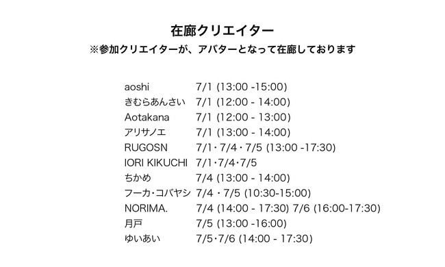 さらに、一部アーティストはアバターとなって数時間在廊いたします。作品やアーティストについて、アバター同士で会話をすることができる貴重な体験をお楽しみいただけます。在廊スケジュールは、以下の画像をご確認ください。
