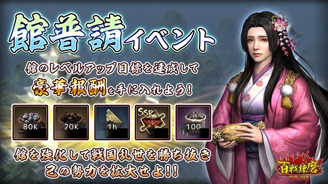 城内の館をイベント条件のレベルまで上昇させると、様々な報酬がもらえるキャンペーンを開催します。今回のイベントで入手できる報酬は、武将の招聘や昇進を行うアイテムや、大量の銀銭(無償)など、戦力強化に欠かせないアイテムとなっています。