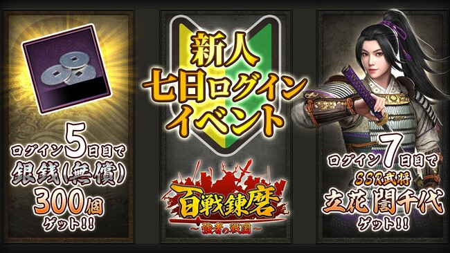 サービス開始を記念したログインイベントを開催します。ログインするだけで、合戦と内政の両方で大活躍間違いなしのSSR武将をはじめ、戦力強化で役立つアイテムなど、様々な報酬を獲得することができます。ログイン5日目では、300銀銭(無償)、ログイン7日目ではSSR武将『立花誾千代』を手に入れることができます。