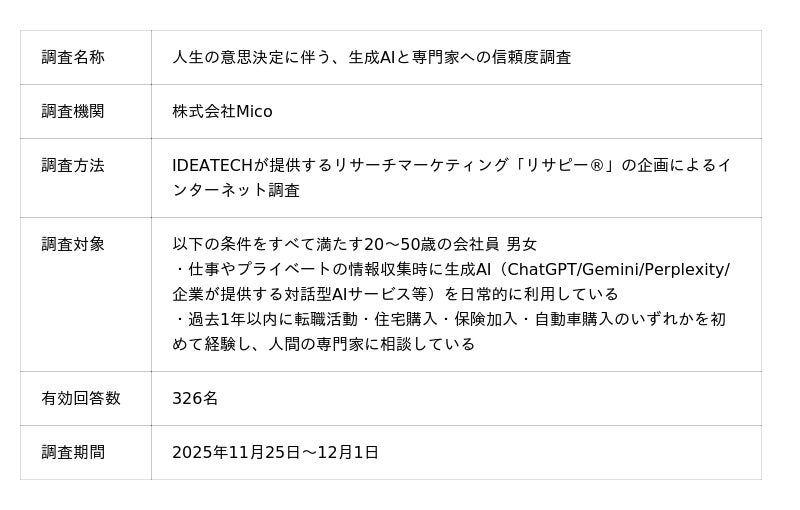 Mico、「生成AIと専門家への信頼度調査」を実施。生成AI利用層の約7割が情報収集・比較検討段階から「専門家への相談を重視」
