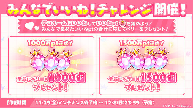 期間中に全プレイヤーで集めた「いいねpt」の総数が目標数を達成すると、全員に賞品をプレゼントいたします。