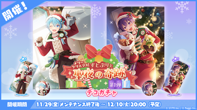 株式会社flaggs(フラッグス)(本社:東京都品川区、代表取締役CEO:吉江 直人)と株式会社STPR(本社:東京都渋谷区、代表取締役:柏原 真人、以下STPR)は、本日11月29日(金)に2.5次元アイドルグループ「すとぷり」の公式ゲームアプリ「すとぷりWith!!(通称:すとうぃず)」のゲーム内イベント「メリークリスマス!すとぷりと聖夜の奇跡 前編」の開催についてお知らせいたします。