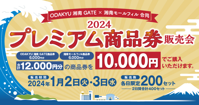 株式会社小田急SCディベロップメント(本社:東京都新宿区 取締役社長:細谷 和一郎)が運営する神奈川県藤沢市の商業施設「ODAKYU 湘南 GATE」(以下、「当施設」)は、2024年の初売りに合わせ、当施設と近隣の商業施設「湘南モールフィル」で使えるプレミアム商品券を2024年1月2日(火)・3日(水)限定で販売します。