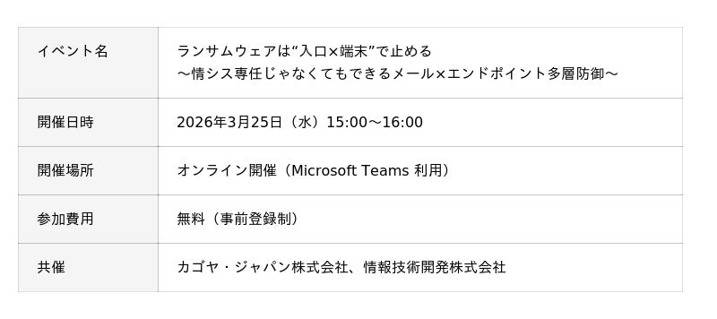カゴヤ・ジャパン株式会社(本社:京都市、以下カゴヤ・ジャパン)と、情報技術開発株式会社(以下tdi)は、ランサムウェアや標的型攻撃への対策をテーマとしたオンラインセミナー「ランサムウェアは“入口×端末”で止める 〜情シス専任じゃなくてもできるメール×エンドポイント多層防御〜」を、2026年3月25日(水)に共催で開催いたします。