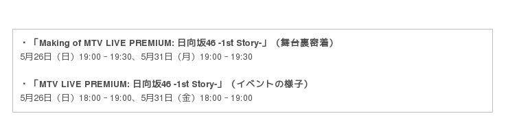 また、MTVではライブ当日の舞台裏に密着した特別番組「Making of MTV LIVE PREMIUM: 日向坂46 -1st Story-」を5月26日(日)19時より放送いたします。