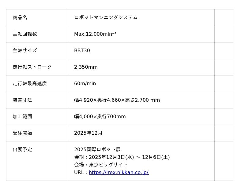 システムには当社製のロボットマシニングユニット「SELFEEDER DUO Robot Edition」を搭載し、切削加工に必要な付帯設備や周辺機器を全て備えています。本商品は、12月3日(水)〜12月6日(土)に東京ビッグサイトで開催される、世界最大級のロボットの専門展示会「2025国際ロボット展※1」にて初公開します。