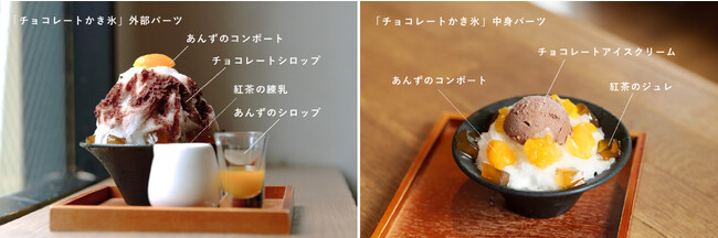 一口目はチョコレートシロップとかき氷を、次に紅茶の練乳で華やかな香りと甘味、もちもちとしたジュレの食感のアクセントをお楽しみください。さらにあんずシロップをかけることで甘酸っぱさと見た目の華やかさをお楽しみいただけます。食べ進めると現れる、かき氷の中に隠れているチョコレートアイスクリームが満足感を加えてくれます。最後に杏のコンポートによってねっとりとした食感の変化があり、凝縮感のある甘みと爽やかな酸味の余韻を楽しめます。