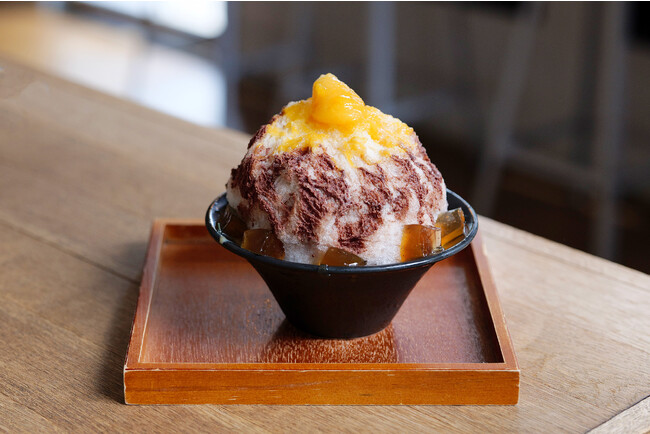 口に入れた瞬間、ふわっとした氷の食感と一緒に満足感のあるチョコレート、紅茶の香りと練乳の甘味、そして甘酸っぱいあんずの味わいが広がる、チョコレート専門店ならではのかき氷です。かき氷の中にはフルーティなチョコレートを使ったアイスクリームが1玉丸々隠れています。今年はあんずソースを用いることで、軽やかながら全体に満足感と華やかさをプラスしました。食べ進めるごとに変化する6パーツのハーモニーをお楽しみください。