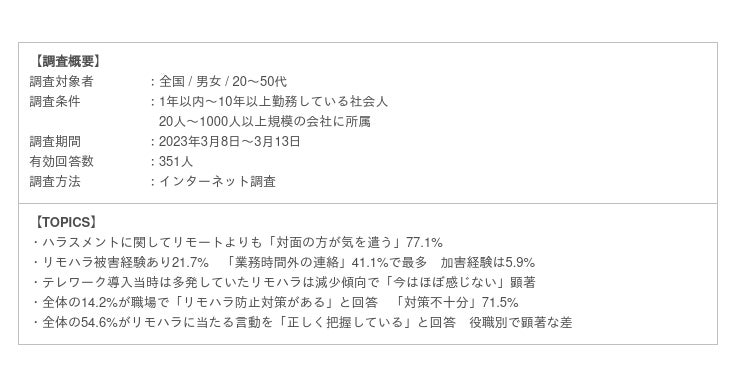 今回実施した調査では、テレワークなど遠隔地で勤務する従業員に対し、オンラインを介して行われるハラスメントを「リモハラ」と定義し、ハラスメントに関して対面とオンラインどちらが気を使うか、リモハラの被害・加害経験とその内容、コロナ禍でのリモハラ増減や企業での防止対策有無とその満足度などを調査した「2023年 リモハラの実態調査」を実施ました。