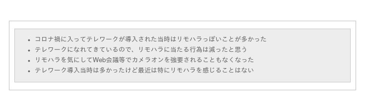 テレワーク開始後のリモハラの増減では、「テレワーク導入事は多かったけど今はほぼない」「テレワークに慣れたことでリモハラを感じることはなくなった」など、リモート環境でのハラスメントについて導入時は多かったものの減少傾向にあり、今ではほぼリモハラがなくなりつつあることがわかります。