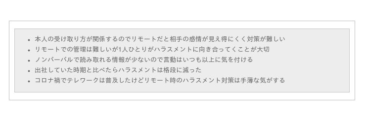 テレワーク導入後、リモハラの増減があったかを記述回答で聞くと、下記のようなコメントが顕著でした。