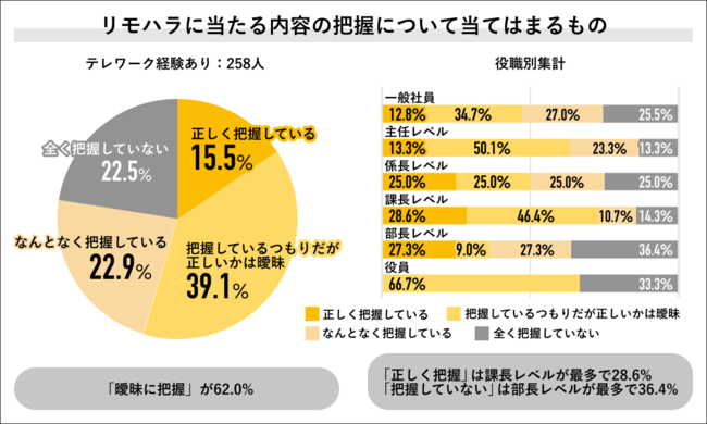 テレワーク経験のある258人にリモハラに当たる内容の把握度を聞くと、「正しく把握している」が15.5%に留まりました。「把握しているつもりだが正しいかは曖昧」39.1%と、「なんとなく把握している」22.9%を合算した62.0%が”曖昧な内容で把握している”を回答しました。「把握していない」は22.5%でした。またこれを役職別で見ていくと、「正しく把握している」の最多回答は課長クラスの28.6%で、「全く把握指していない」の最多は部長クラスの36.4%でした。