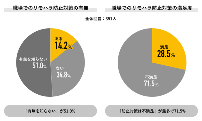 回答者全体の351人に職場でのリモハラ防止対策の有無を聞くと、「有無を知らない」が51.0%で最多回答になり、次いで「ない」が34.8%、「ある」が14.2%でした。また現状のリモハラ防止対策についての満足度を聞くと、「満足」28.5%、「不満足」71.5%の回答結果でした。