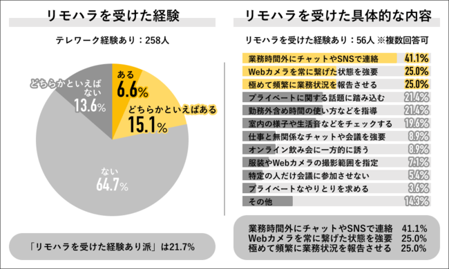 またリモハラの被害経験がある56人に具体的な内容を聞くと「業務時間外にチャットやSNSで連絡」が41.1%で最多になり、次いで「Webカメラを常に繋げた状態を強要」が25.0%、「極めて頻繁に業務状況を報告させられる」が25.0%で上位3つの回答でした。