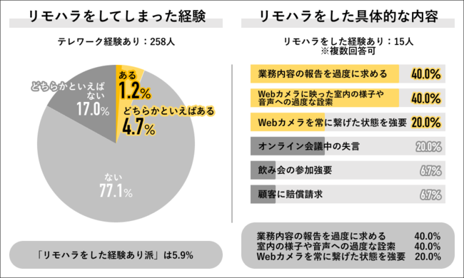 また、リモハラをしてしまったと思う具体的な内容では、「業務内容の報告を過度に求める」40.0%と「Webカメラに映った室内の様子や音声に過度な詮索」40.0%が同率の最多回答になり、次いで「Webカメラを常に繋げた状態を強要」が20.0%で上位3つの回答結果になりました。