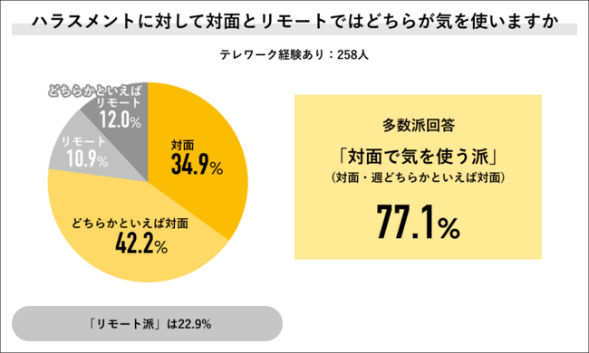 テレワークの経験がある258人にハラスメントにおいて対面とリモートではどちらが気を使うかを聞くと、「対面」34.9%と、「どちらかといえば対面」42.2%を合算した、77.1%が”対面派”の回答をしました。”リモート派”の回答は22.9%で、内訳は「リモート」が10.9%で、「どちらかといえばリモート」が12.0%でした。