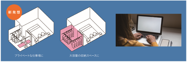 リモートワークを自宅で行うことになったものの、仕事専用スペースが足りず音漏れ等家族に気を遣いながら仕事をしている方が多く見受けられます。「リモーゼット」は、ウォークインクローゼットに可動棚と照明、コンセントを設置。大型収納としても併用可能な「プライベート空間」を実現します。