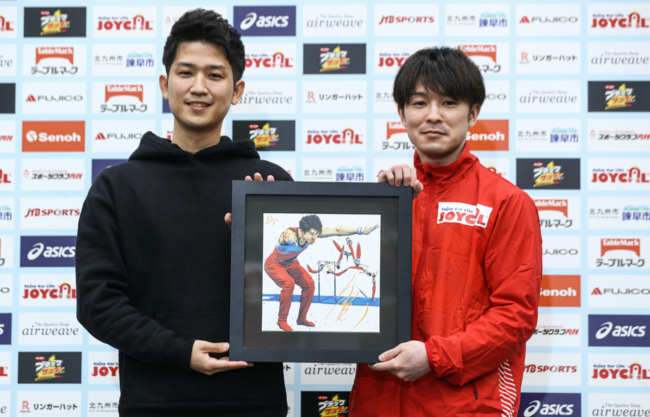 内村航平がこだわり続けた着地の瞬間を描いたアートはイラストアーティスト・田村大がその制作を手掛け、ダイナミックで躍動感あふれるメモリアルな作品に仕上がっています。
