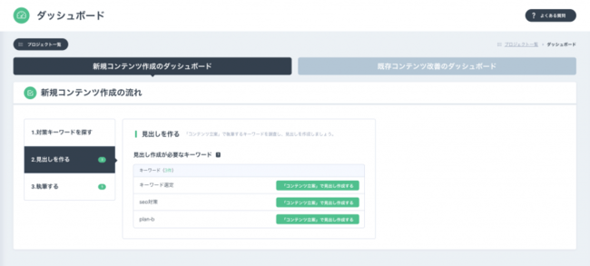 第一弾のリリースにて、「新規コンテンツの作成」と「既存コンテンツの改善」という2つのフローをご用意しました。それぞれ画面上の案内にしたがって機能を使っていけば、コンテンツSEOを正しいステップで進めていただけます。