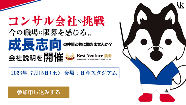 企業のマーケティング、DX化などの支援を行う株式会社H&K(本社:神奈川県横浜市、支店:茨城県土浦市、代表取締役CEO:安藤弘樹)が、2023年7月15日(土)16時00分〜19時00分で日産スタジアムにて「会社説明会 × サッカー観戦」の採用イベントを開催いたします。
