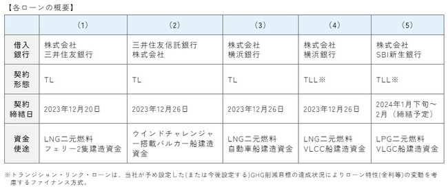 また、本フレームワークに基づき、トランジション・ローン(以下「TL」)3件及びトランジション・リンク・ローン(以下「TLL」)1件の融資契約を下記の通り当社グループにて締結を完了し、さらにTLL1件についても締結を予定しております(註4)。