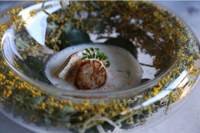 ミモザオイルを加えた甘みのある新玉ねぎのソースに、帆立のソテーを浮かべた前菜。筍と木の芽を添え、春の訪れを感じられる一品です。