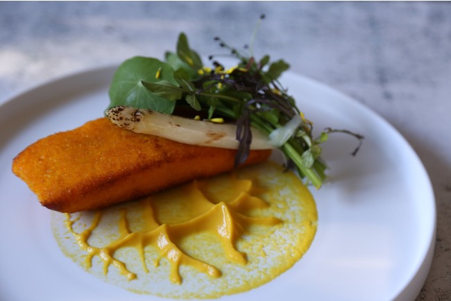 旬の桜鱒にサフランを混ぜたパン粉をつけ、黄金色のカツレツにしました。パプリカをベースにしたミモザ色のソースと合わせてお召し上がりください。